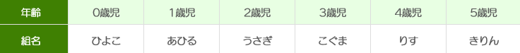 0歳児 | 1歳児 | 2歳児 | 幼児組 | ||||